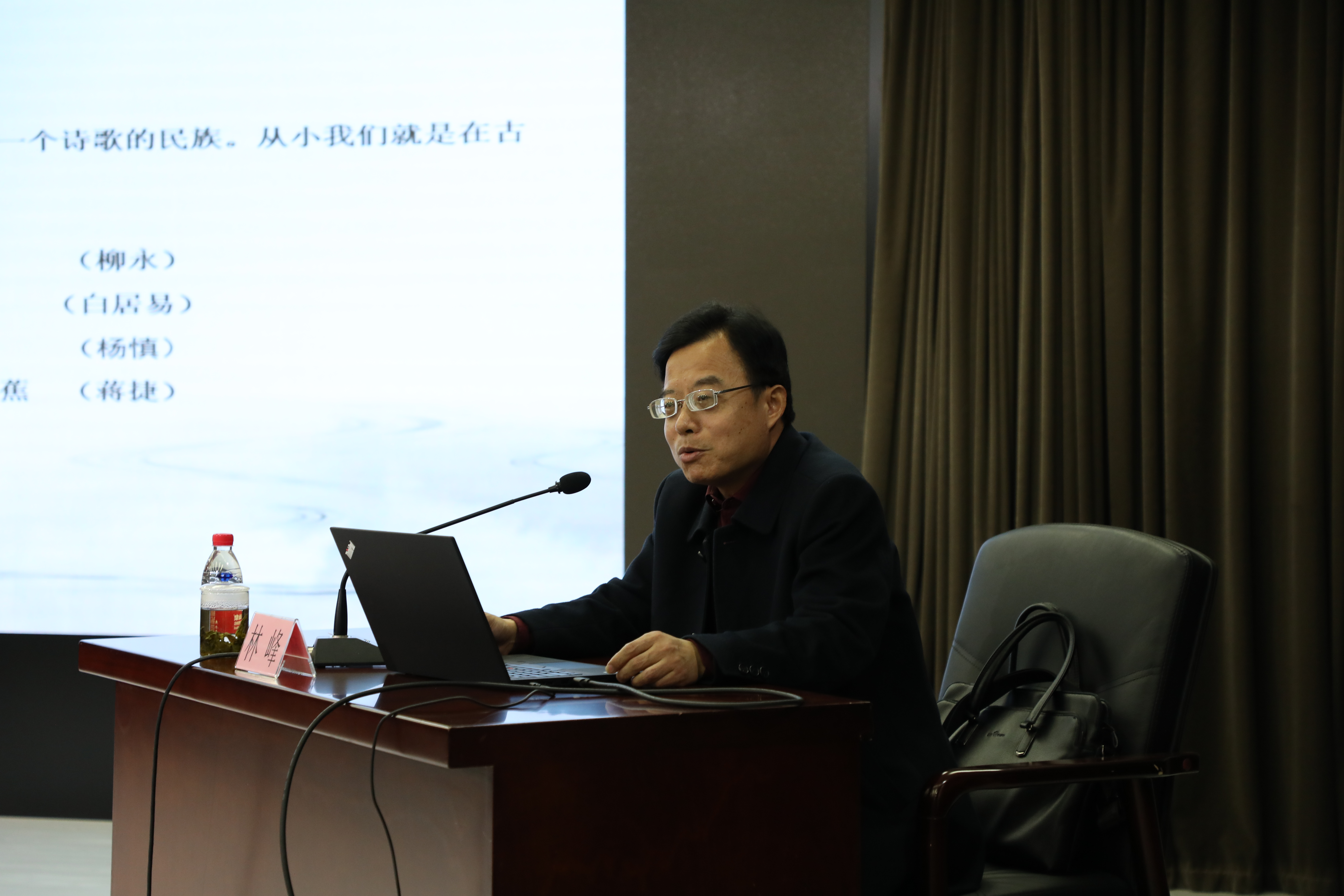 林峰副會長圍繞“時代呼喚傳統詩詞”“傳統詩詞的現實意義”兩個重點,通過大量優秀詩詞作品,生動講述了詩詞與我們的淵源,詩詞遠離人們視野的原因,詩詞的現狀,詩詞對人們氣質修養、學習態度、精神境界、愛國思想及抒發情感的影響。
