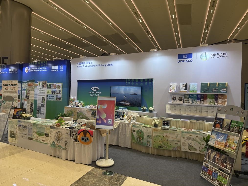 2025年9月22日-25日,聯(lián)合國教科文組織第五屆世界生物圈保護(hù)區(qū)大會(WCBR)在浙江杭州舉辦。中國環(huán)境出版集團(tuán)以“生態(tài)之眸(The Eyes of Ecology)”為主題參加大會展覽,集中展示《生態(tài)之眸》(中英文)等生態(tài)保護(hù)圖書50余種、《環(huán)境保護(hù)》生物多樣性專刊、中國國家公園全景展示系列平臺、“尋美中國”系列宣傳視頻,并聯(lián)合中國濕地博物館、中國生態(tài)文明研究與促進(jìn)會、北京市企業(yè)家環(huán)保基金會、神農(nóng)架世界生物圈保護(hù)區(qū)、九寨溝國家級自然保護(hù)區(qū)管理局、廣州市海洋雙碳研究會、深圳市紅樹林濕地保護(hù)基金會、湖北五峰后河國家級自然保護(hù)區(qū)管理局、光明網(wǎng)等多家單位,以及海南、福建、湖北、廣東、上海、杭州等地方生態(tài)環(huán)境系統(tǒng)單位,展示來自全國36家單位的百余件生態(tài)環(huán)保文創(chuàng)產(chǎn)品。
